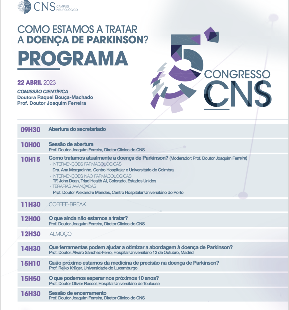 No dia 22 de abril irá realizar-se o 5º CONGRESSO CNS dedicado ao tema “Como estamos a tratar a Doença de Parkinson?” e contará com a presença de especialistas nacionais e internacionais na área da doença de Parkinson e outras doenças do movimento.