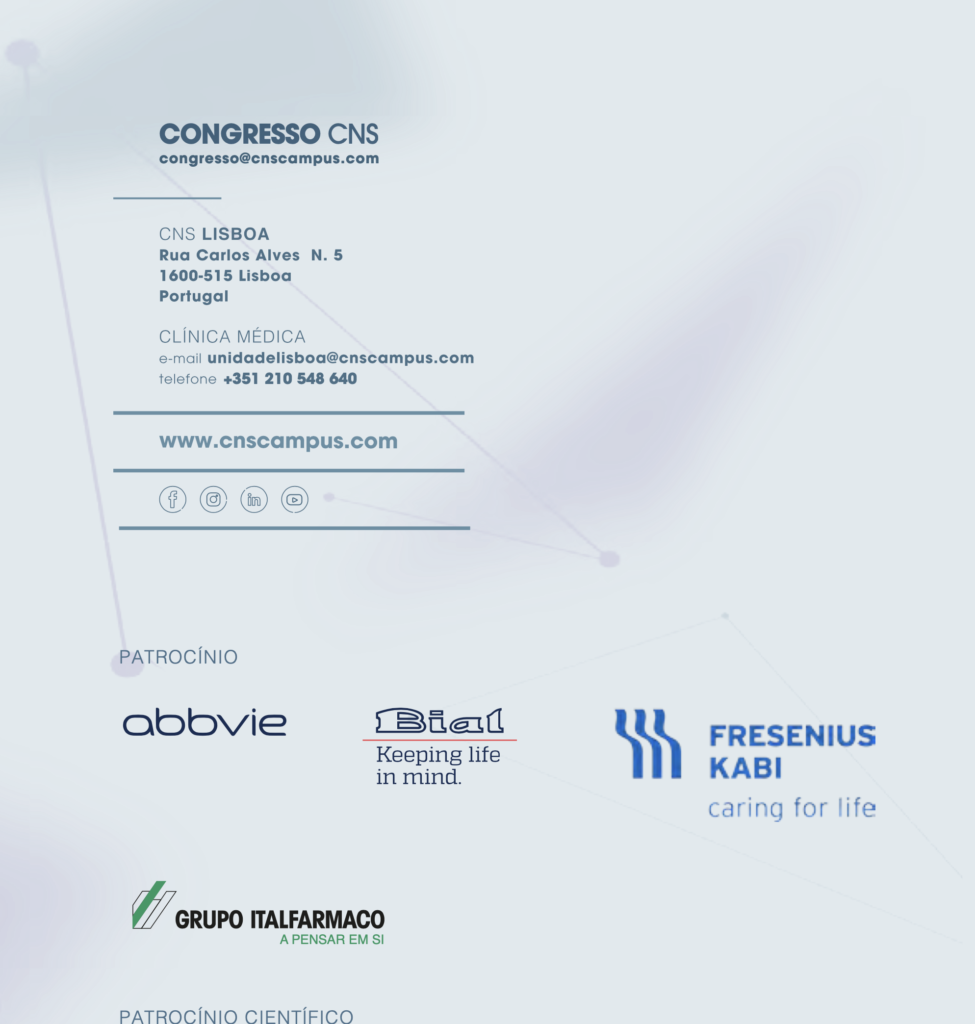 O congresso conta com o Patrocínio Científico da Ordem dos Médicos e da Sociedade Portuguesa de Doenças do Movimento (SPDMov). Agradecemos à Abbvie, Bial, Fresenius e Italfarmaco o apoio para a realização do evento.